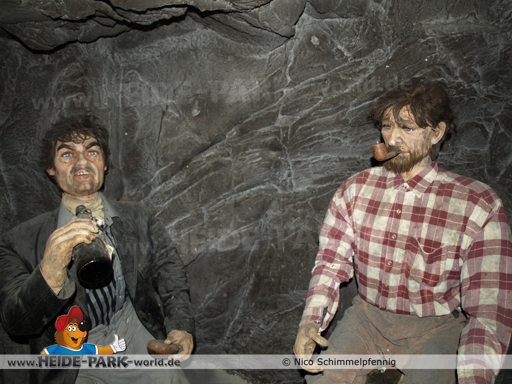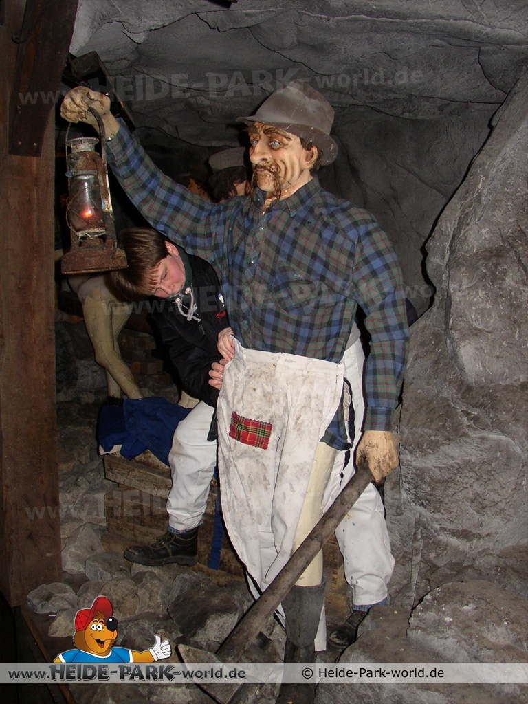 Der Wartebereich verlief vorbei an verschiedenen kleinen Szenen, welche mit elektronisch gesteuerten Bergwerksleuten (Animatronics) ausgestattet waren. Ihre Sprüche und Dialoge prägten sich in die Erinnerungen vieler Besucher ein. So gab es eine Gruppe von Bergarbeitern, die eifrig Skat spielte oder einen Zeitung lesenden und fleißig rauchenden Gesellen, der aus einem Artikel über eine Bergwerksexplosion vorliest – natürlich mit einem kleinen Augenzwinkern. Nachdem man diesen Teil des Wartebereichs durchquert hatte, ging es weiter im großen Rondell, welches einmal im Kreis über den ebenso kreisförmigen Einstieg der Bahn verlief. Unten am Einstieg angekommen stieg man in eines der bis zu 40 Boote.