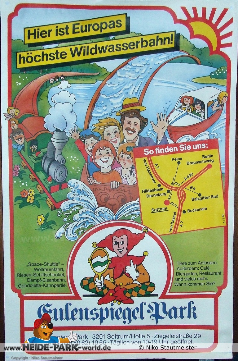 Am 9. Juli 1982 eröffnete die Schaustellerfamilie Fichtelmann, auch heute noch bekannt für Ihre Festzelte und Bratwurst, den 250.000m² großen Eulenspiegelpark auf dem Gelände einer ehemaligen Ziegelei in der Nähe der Kleinstadt Holle im schönen Leinebergland. Hier gab es "Europas höchste Wildwasserbahn" (O-Ton: "Auf zur Mutprobe! Daten für eine Abenteuerfahrt auf dem Wasser: 500 Meter lang ist die Strecke, die in rund fünf Minuten zurückgelegt wird. Drei starke Lifte hieven die Boote auf 17 Meter - und dann folgt die Schussfahrt hinunter. Dieses Erlebnis ist so riesig, dass es jeder wiederholen möchte. Kein Problem für die Besucher, da die beliebige Benutzung der Wildwasserbahn im Eintrittspreis enthalten ist.")